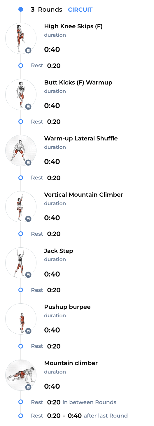 Strength Training Circuit: 7 Exercises, 40 seconds each, followed by 20 seconds of rest.