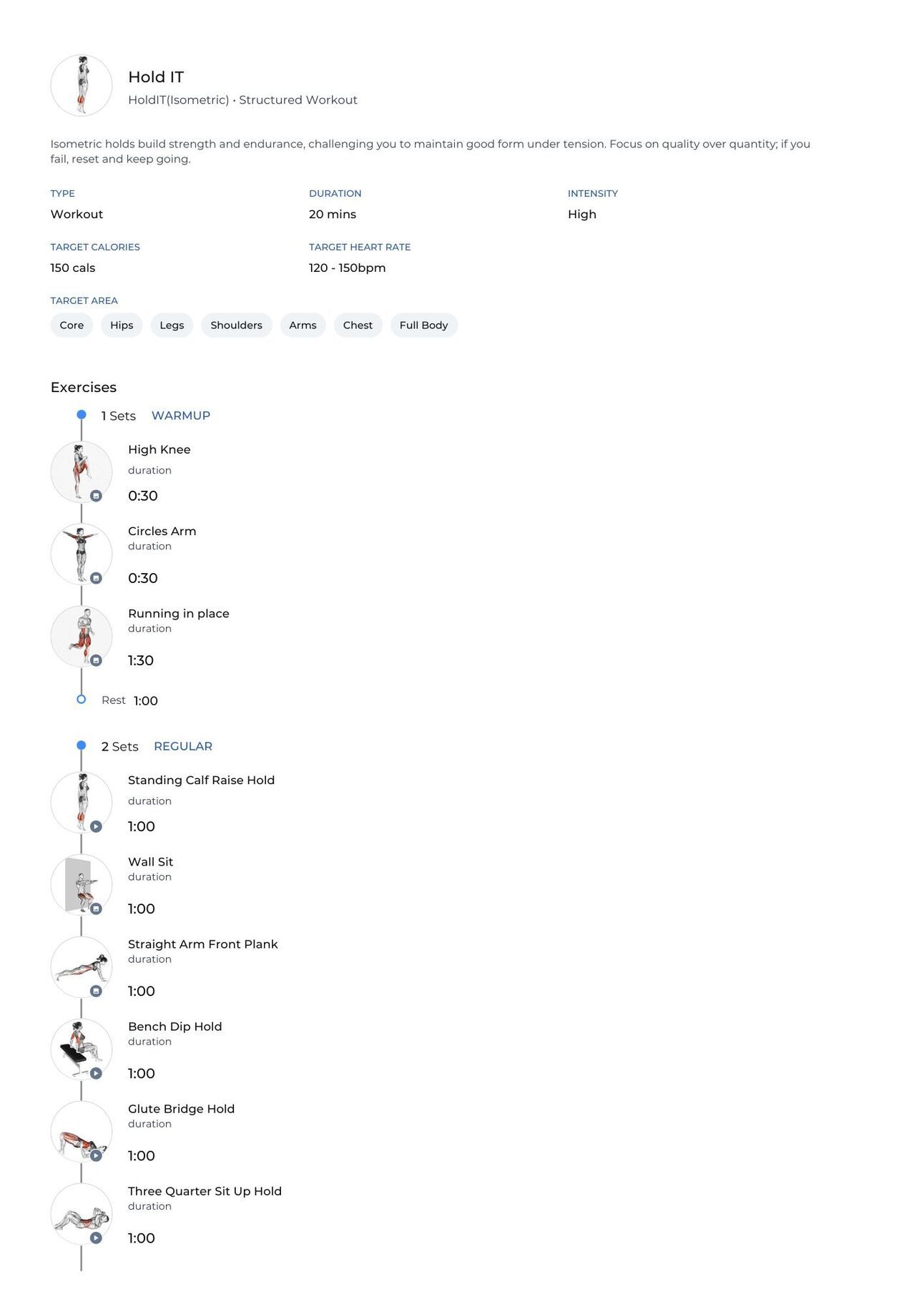 Isometric holds build strength and endurance, challenging you to maintain good form under tension. Focus on quality over quantity. Reset and keep going if you fail.