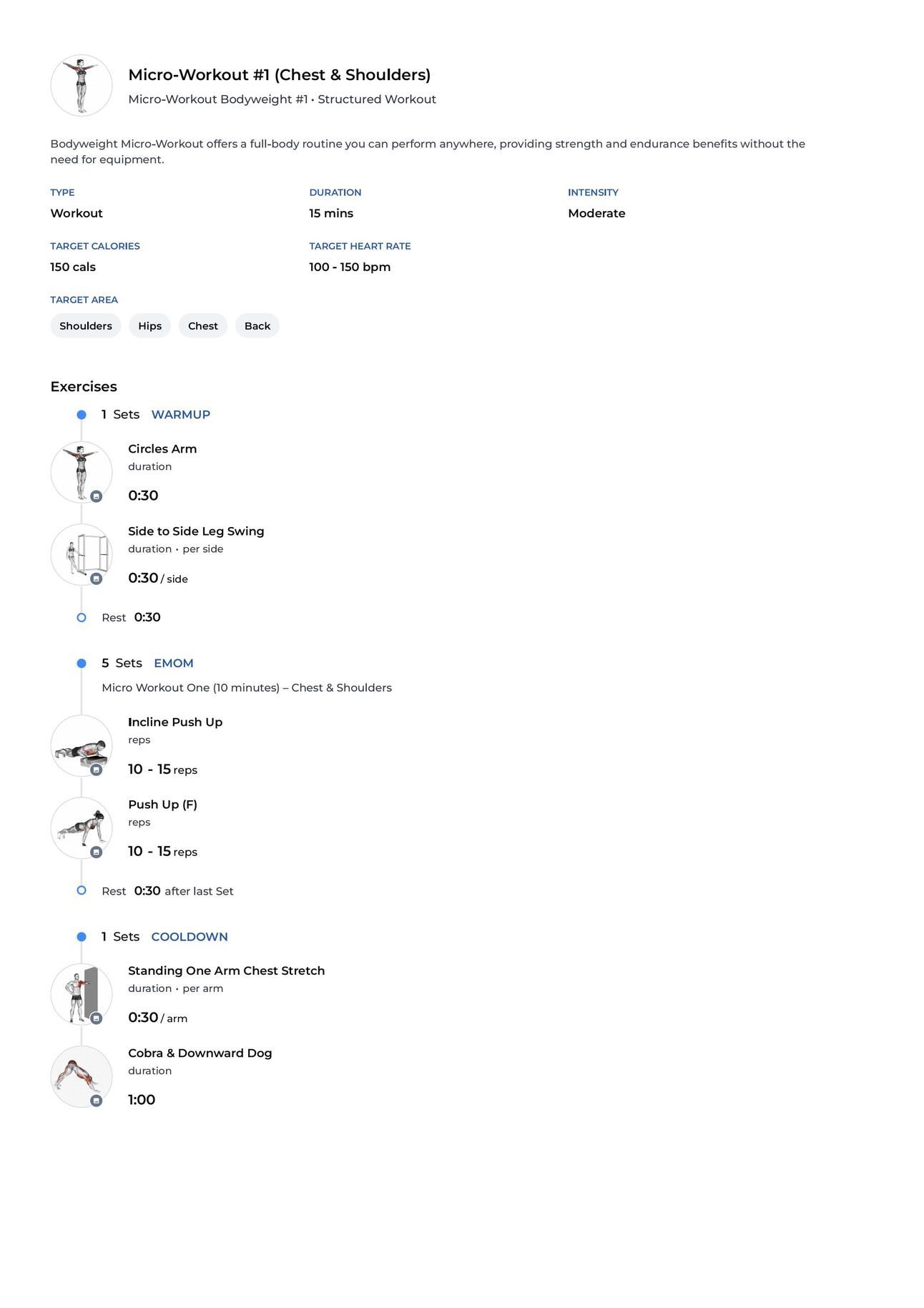 Micro workouts involve short bursts of exercise that you can fit into your daily routine without requiring a full gym session. This session focuses on the shoulders and chest using your body weight.