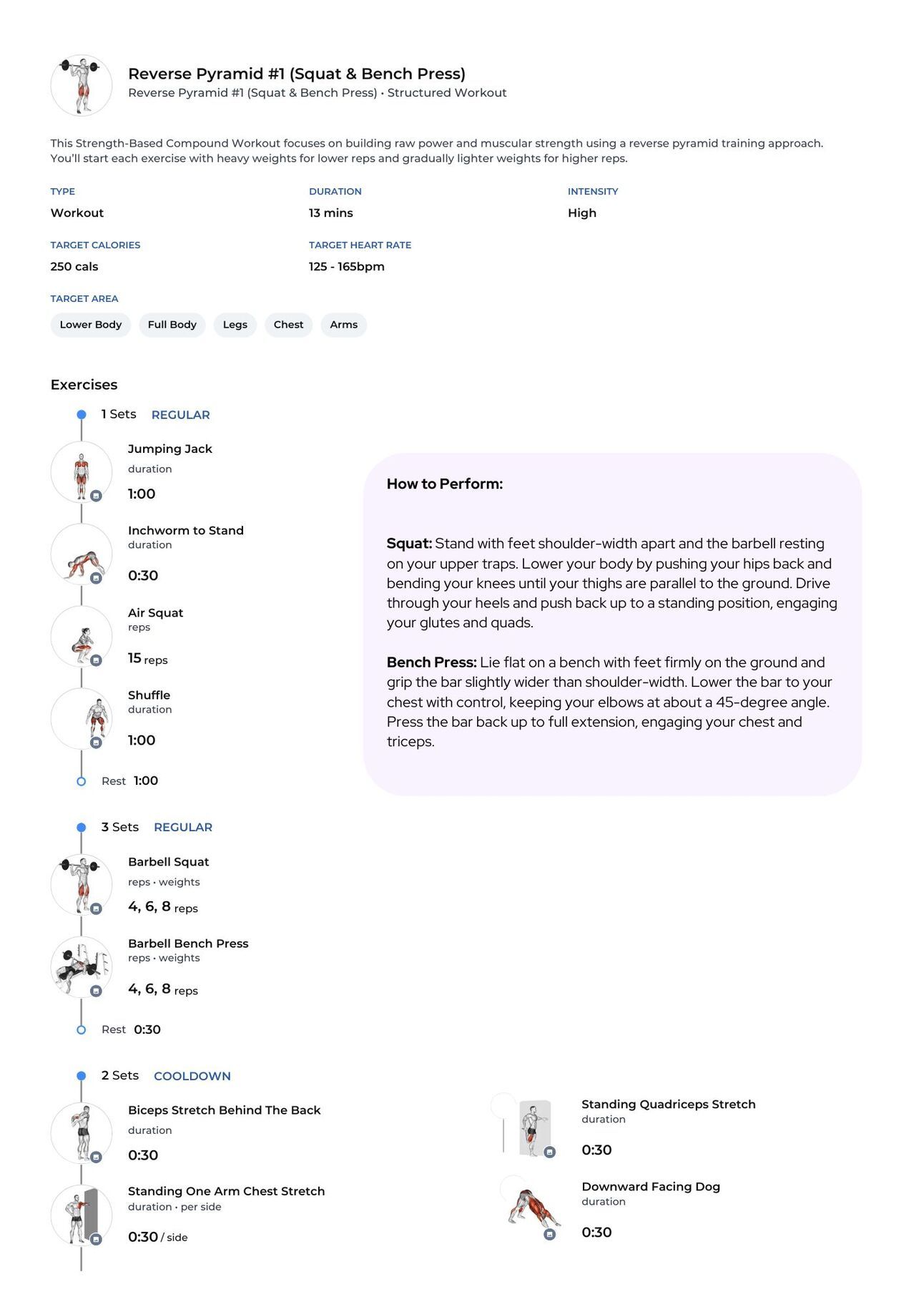 This Strength-Based Compound Workout uses a reverse pyramid training approach to build raw power and muscular strength. You’ll start each exercise with heavy weights for lower reps and gradually lighter weights for higher reps.